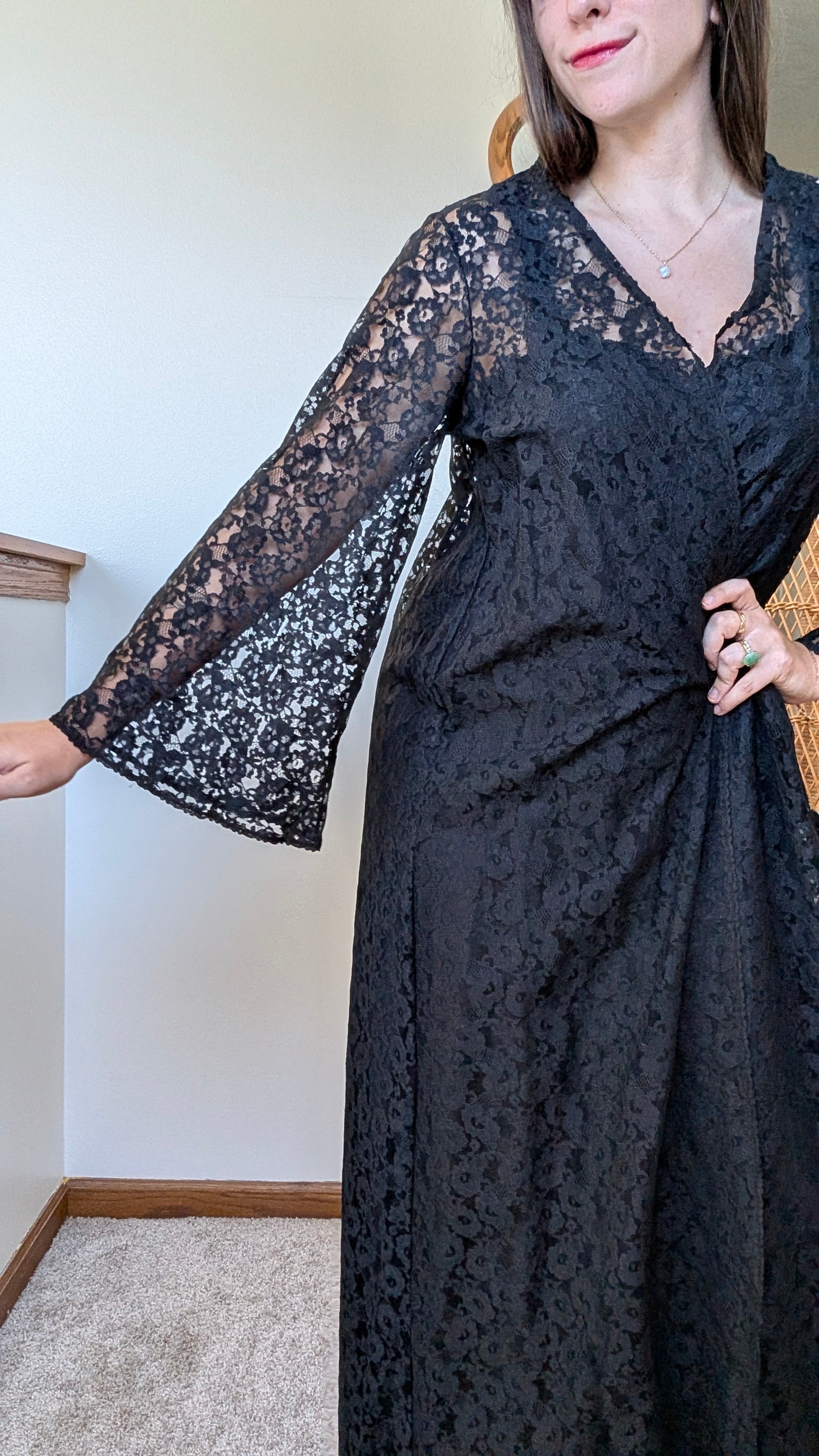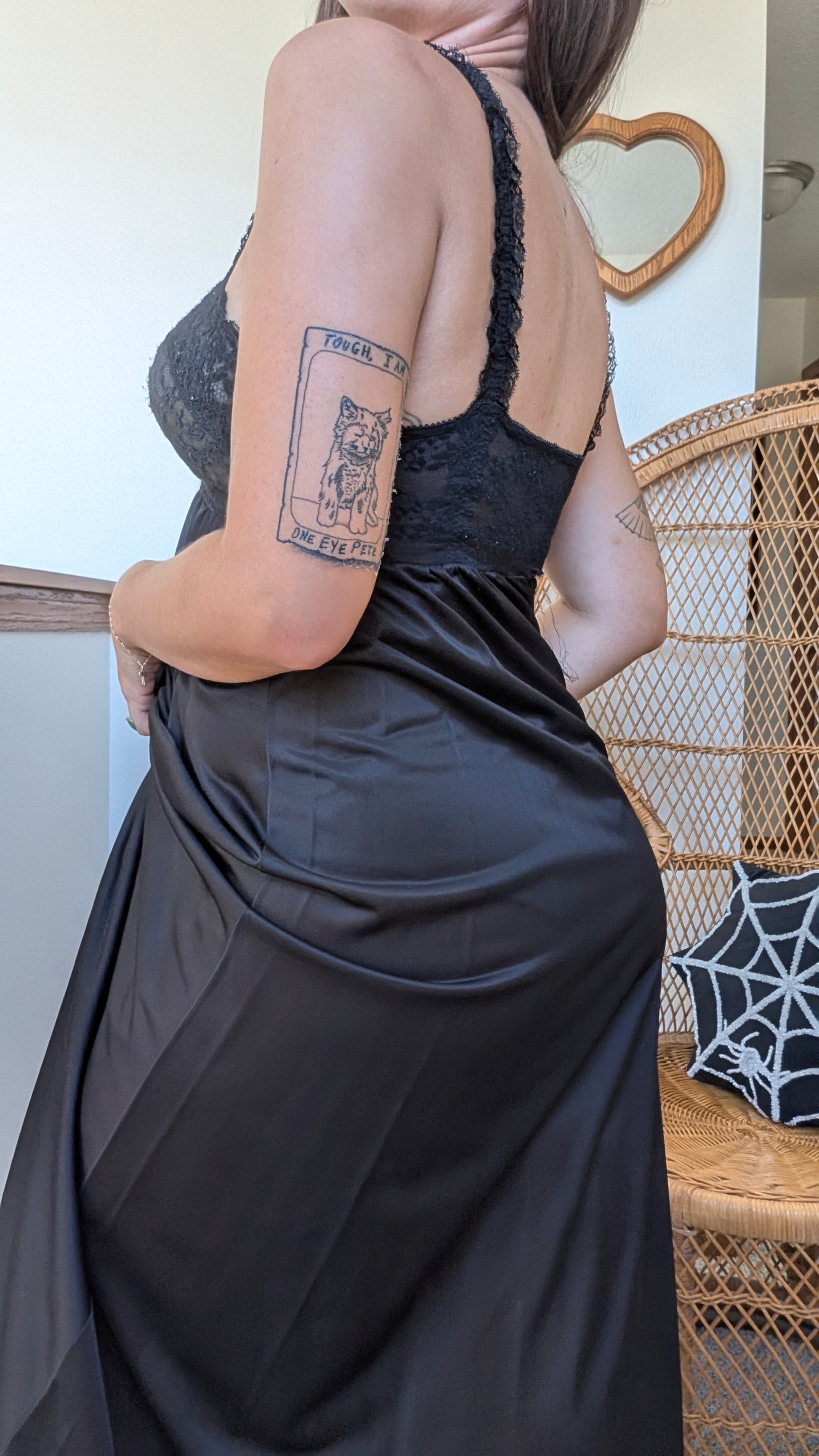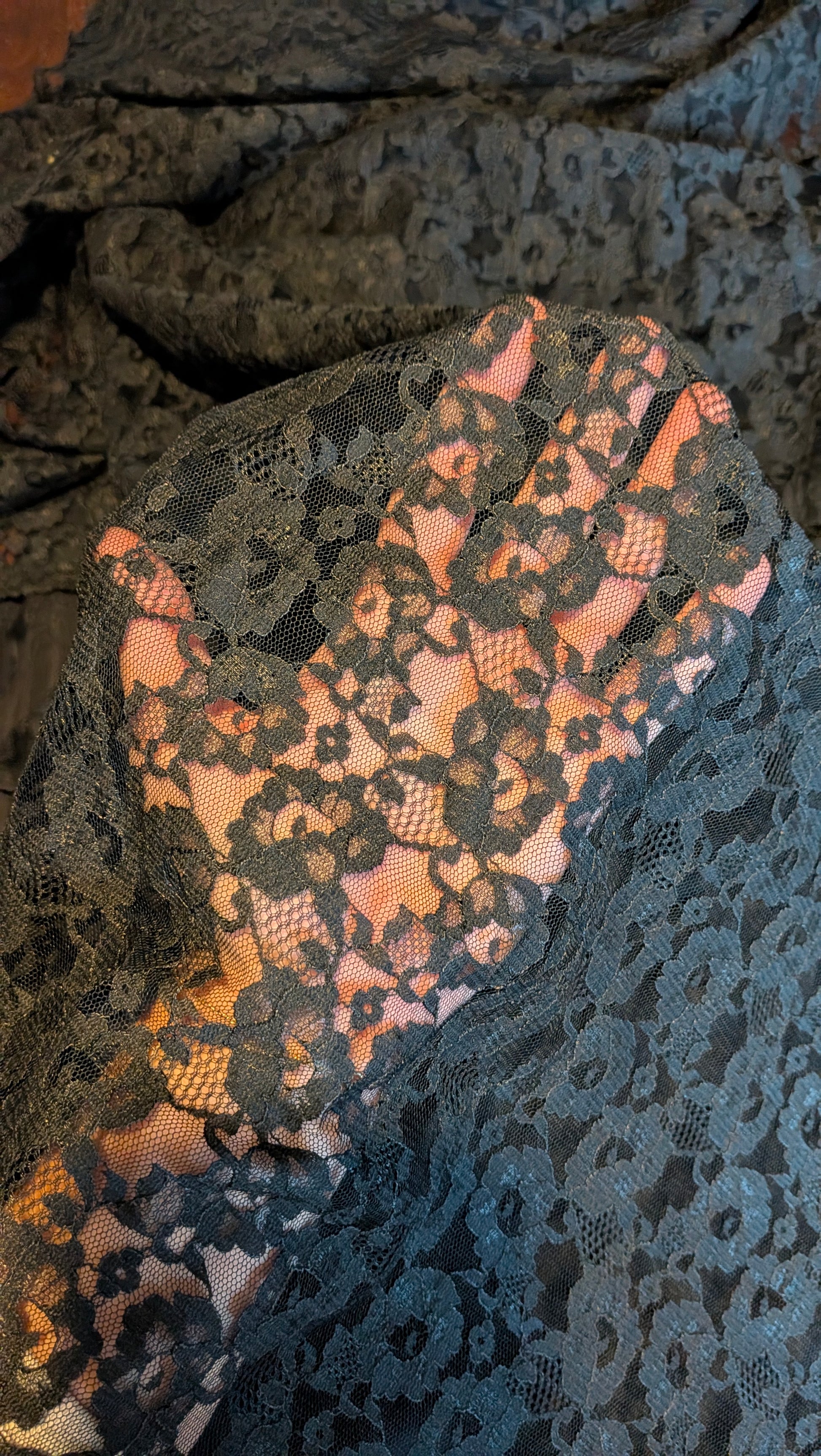 Small split in scalloped lace at left underarm. Repair has been made at center back where lace bodice meets nylon skirt.